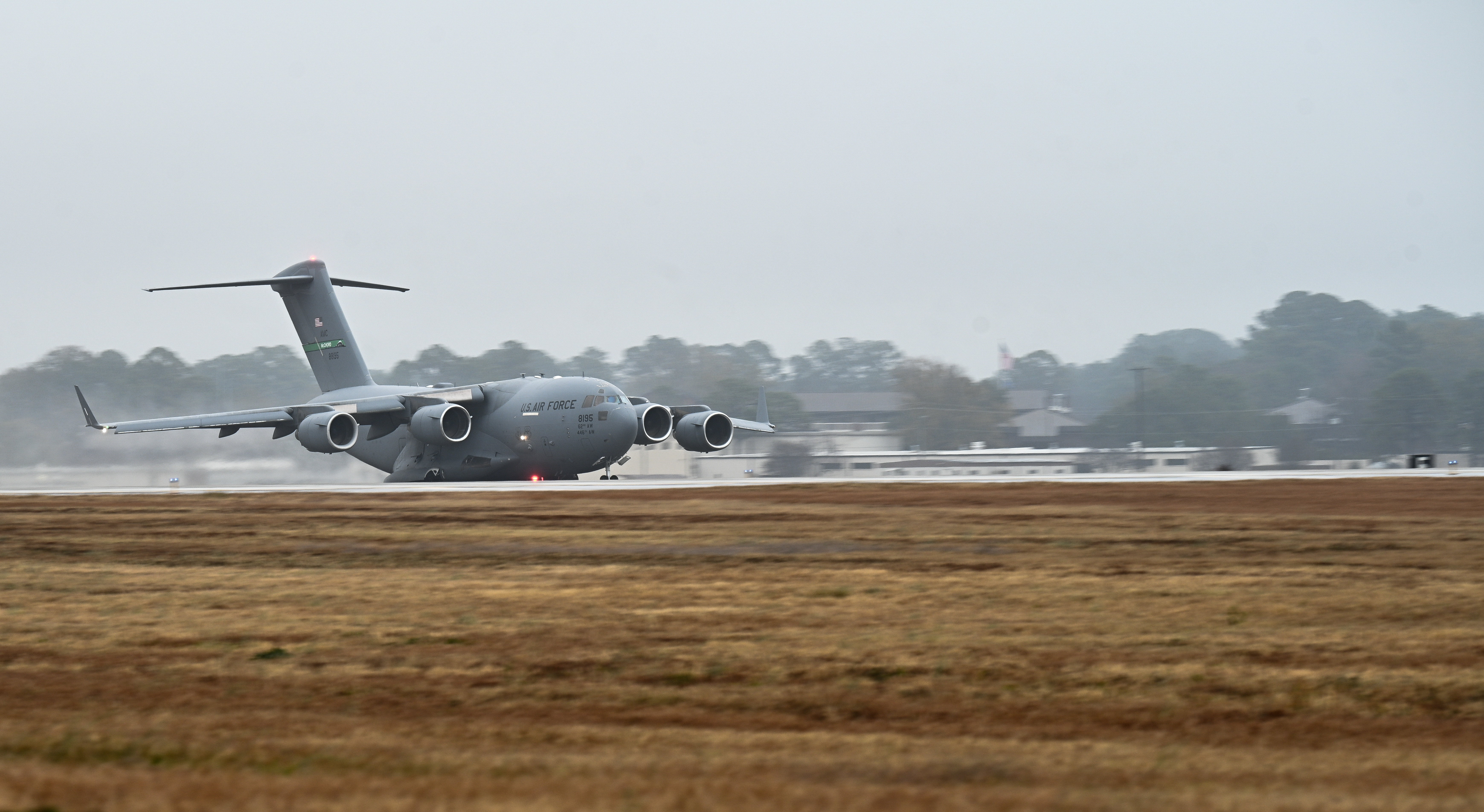A C-17 Globemaster III takes off during Battalion Mass Tactical Week (BMTW) 26-01 on Pope Army Airfield, N.C., Dec. 2, 2025. BMTWs are a brand of mobility exercise lead at the behest of Air Mobility Command (AMC) and are a mainstay at Pope. (U.S. Air Force photo by Staff Sgt. Solomon Cook)