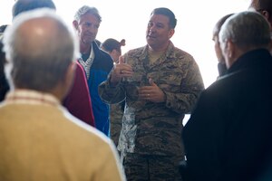 Brig. Gen. Brian Robinson (center), Air Mobility Command director of operations, meets with Col. Kelly Holbert (right), 43d Air Mobility Operations Group commander, and Chief Master Sgt. James Cope, 43d AMOG superintendent, during a brief visit to Pope Field Feb. 3. Robinson attended the Joint